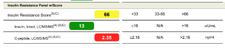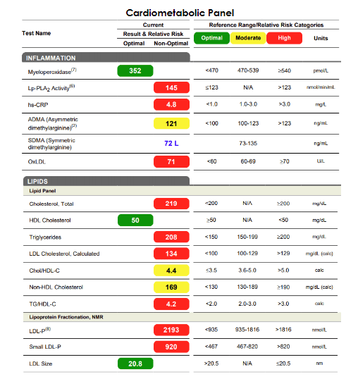 The results are measured in optimal, moderate or high risk for heart disease. Many of my markers were marked red for high risk. I even had high risk for one of the markers for insulin resistance. My c-peptide was above the highest risk factor level, indicating that I was on my way to a possible type 2 diabetes diagnosis. YIKES.