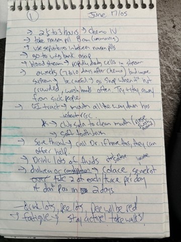 I grabbed it and was unexpectedly met with a STARK reminder on the importance of HEALTH and taking care of myself. The fist page is a list in my writing with notes I took from my mom’s visit to her chemo doctor’s office on June 17, 2005. I’ve included a screenshot of page 1 of these notes, but it goes on for a few pages.