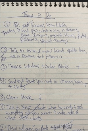 Even more stark as I flip through the note pad is another note titled ‘Things to Do’ and this is one page of a list of things I had to do in order to plan my mother’s funeral and get her house cleaned up and ready for sale.